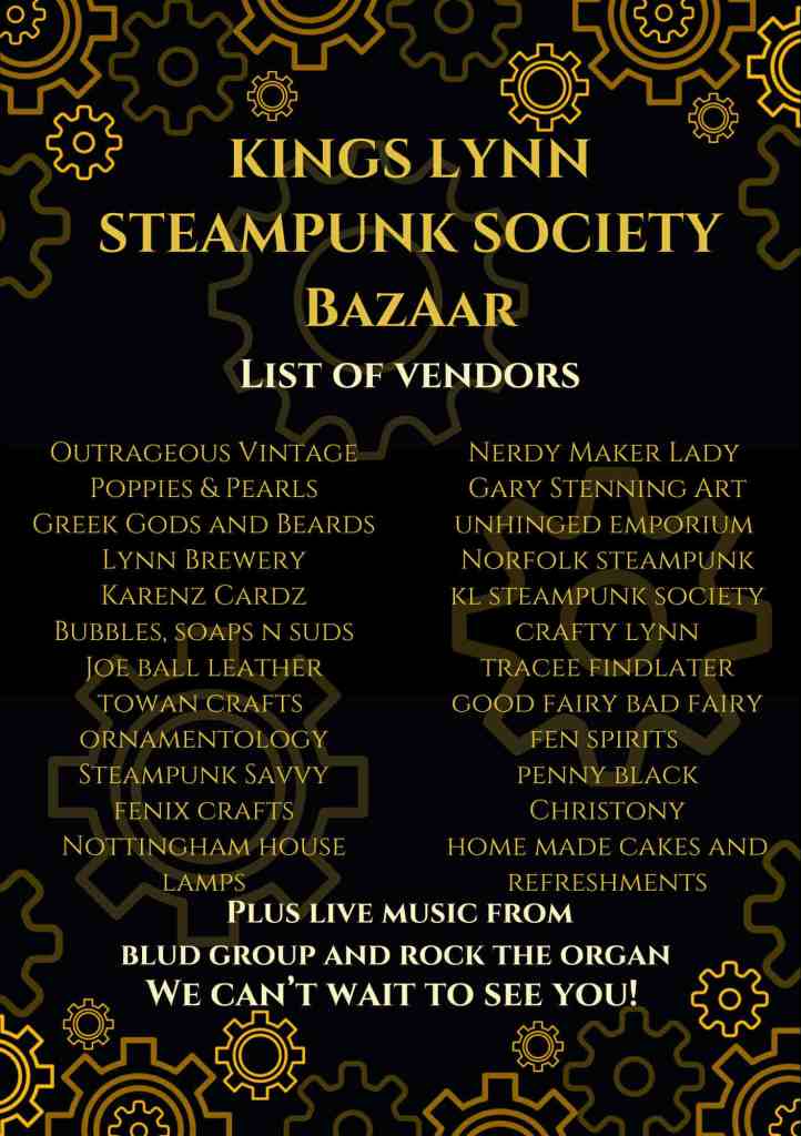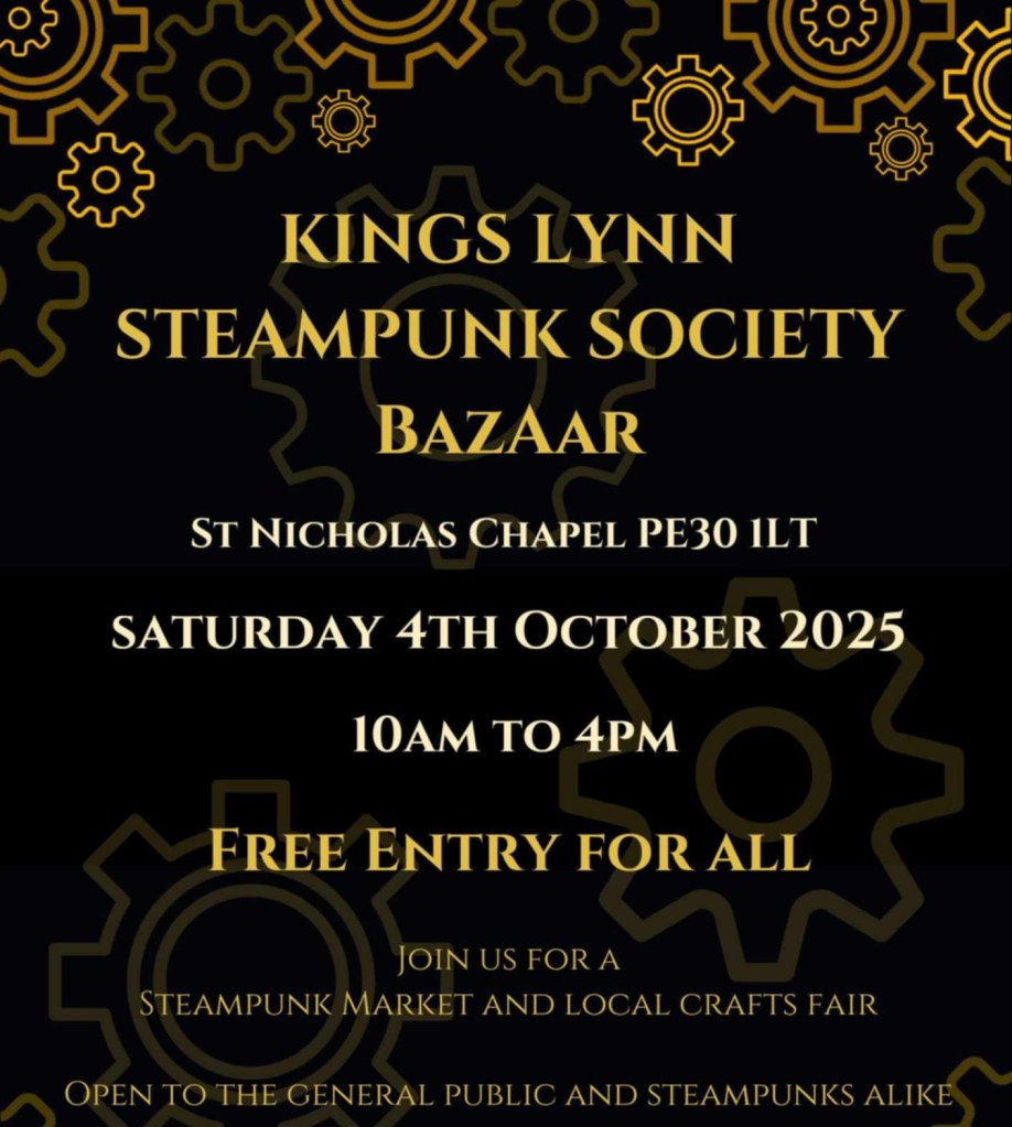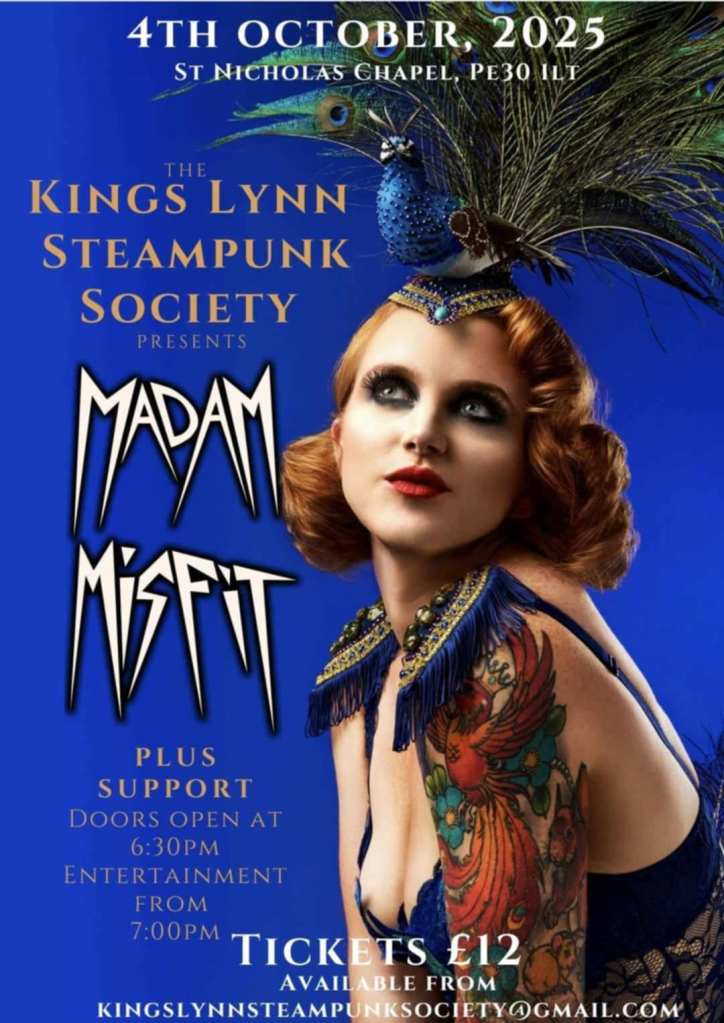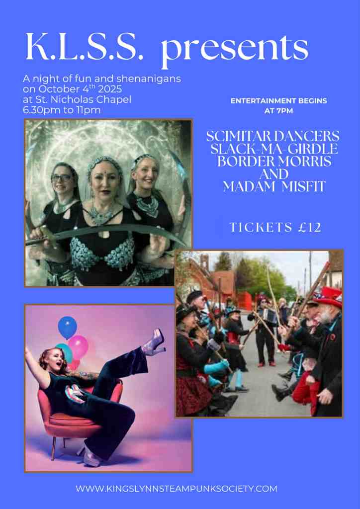 Join King’s Lynn Steampunk Society for evening entertainment at St Nicholas Chapel on the 4th October to see SlackMagirdle, Steampunk Morris Dancers, Scimitar Dancers and the Inimitable Madam Misfit. Licensed bar. Dress to impress. Tickets available for £12.00. Here is the link for online booking for our Madam Misfit performance on 4 October – grab the chance to see her in exuberant action https://www.ticketsource.co.uk/whats-on/kings-lynn/st-nicholas-chapel/klss-presents/2025-10-04/18:30/t-vvloavj